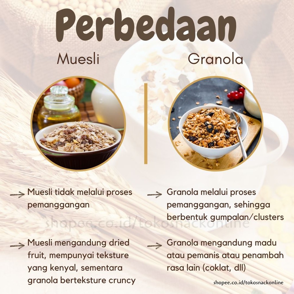 Muesli sering kali disamakan dengan granola, tapi biasanya muesli merupakan pilihan yang lebih alami sekaligus lebih sedikit gulanya, sehingga menjadikannya sarapan yang lebih sehat daripada granola. Lihat juga resep granola (no oven) enak lainnya. Ia dimakan untuk sarapan, seperti yang mereka katakan, dan tua dan muda, dan miskin, dan kaya.